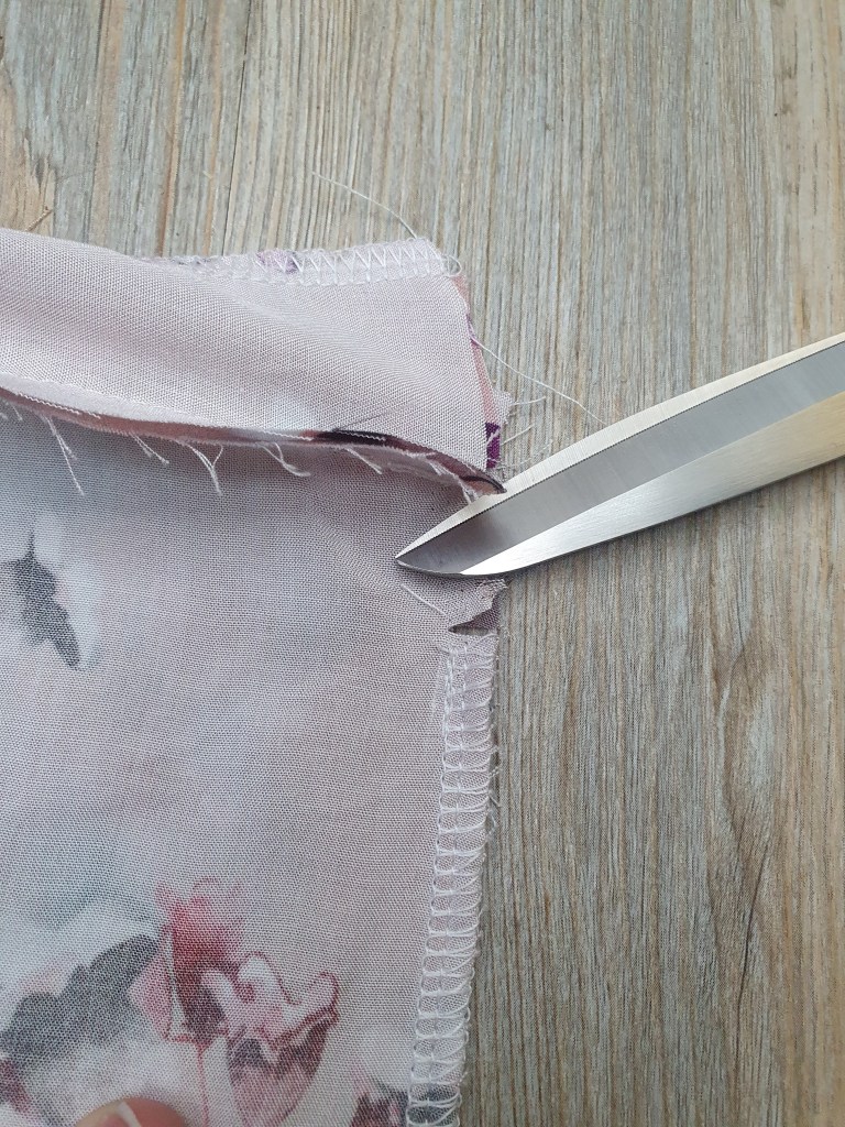 Strijk daarna alles netjes open. Doordat je de zijnaad hebt ingeknipt kun je het helemaal openvouwen, ik heb het daarom afgelockt (foto 1). Vouw het daarna naar binnen en stik een zoom. Als je daarna de band op de rok naar binnen vouwt, ontstaat de tunnel. Zoom deze door en haar de strikband er door heen. De onderrand afzomen en de rok is klaar!