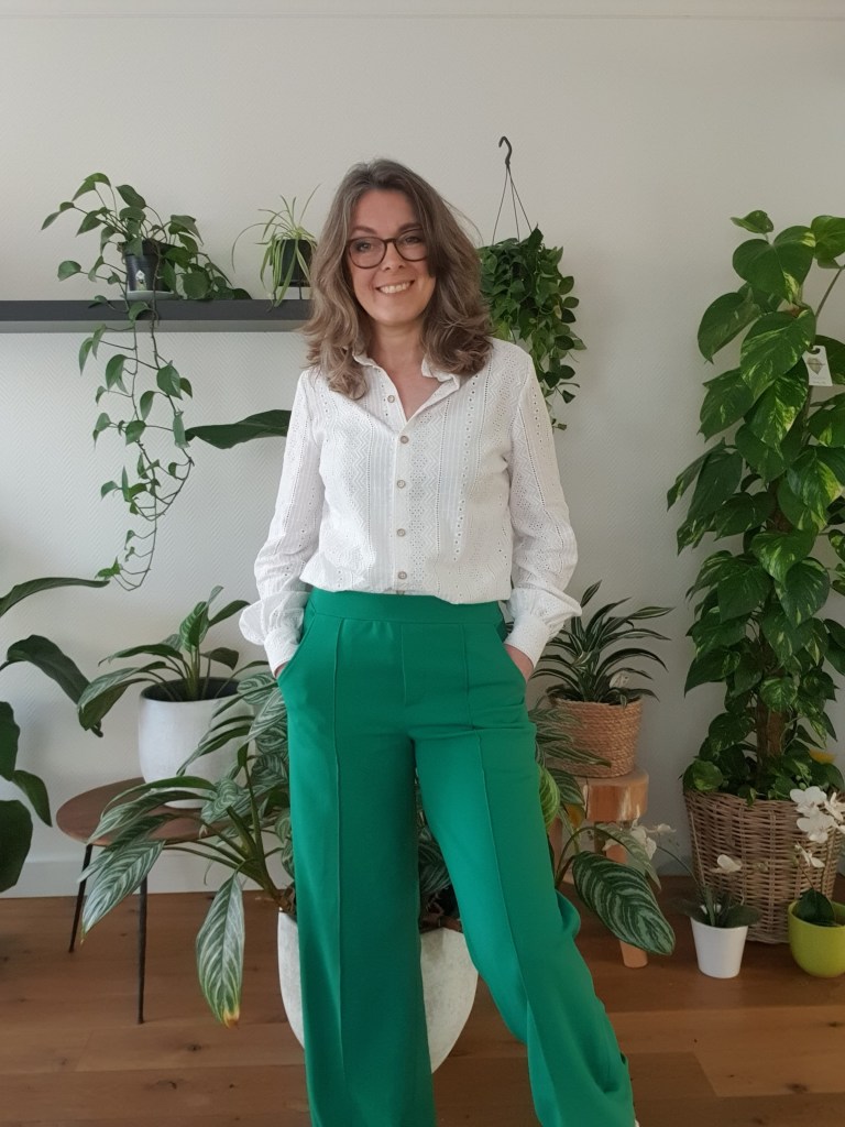 - de groene broek is de Bay pants van Bel’Etoile