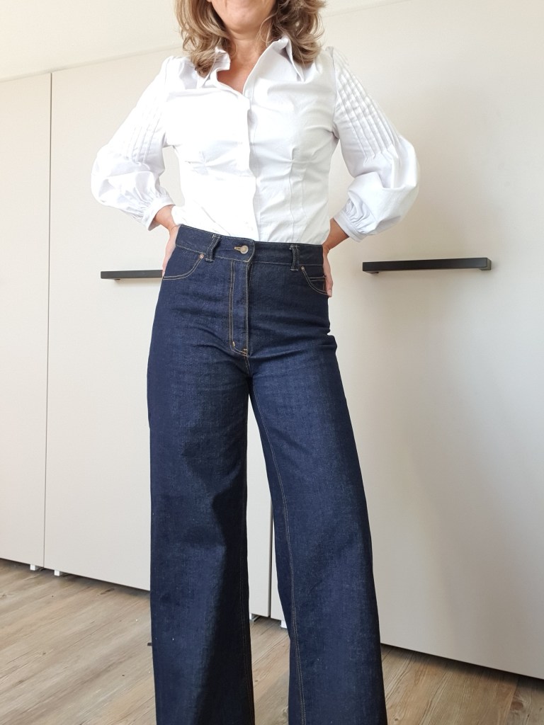 Deze jeans vind ik zalig: hoog in de taille en wijde pijpen. Ik vind comfort steeds belangrijker en draag dus geen al te knellende broeken meer. Deze zit fijn. Ik houd rekening met een beetje extra ruimte op de heupen. Verder pas ik de achterpas een beetje aan vanwege mijn ietwat holle rug. Mijn advies bij het naaien van jeans: pas elke stap door. Speld of naai alles met een losse steek in elkaar en pas het voordat je met sierstiksels aan de slag gaat.