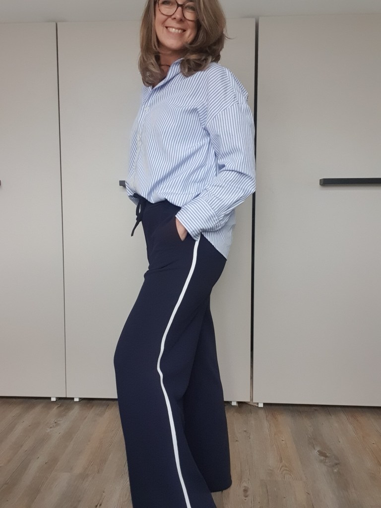 Deze broek is van Knipmode, en is een comfortabele broek. Heerlijk om zo aan te schieten, maar ook gewoon goed gekleed. Het model is redelijk gemakkelijk. Vind je zakken in de zijnaad lastig, dan laat je deze weg. Hierdoor is het een goed model voor de beginnende sewista. Alle rekbare stoffen zijn geschikt.
